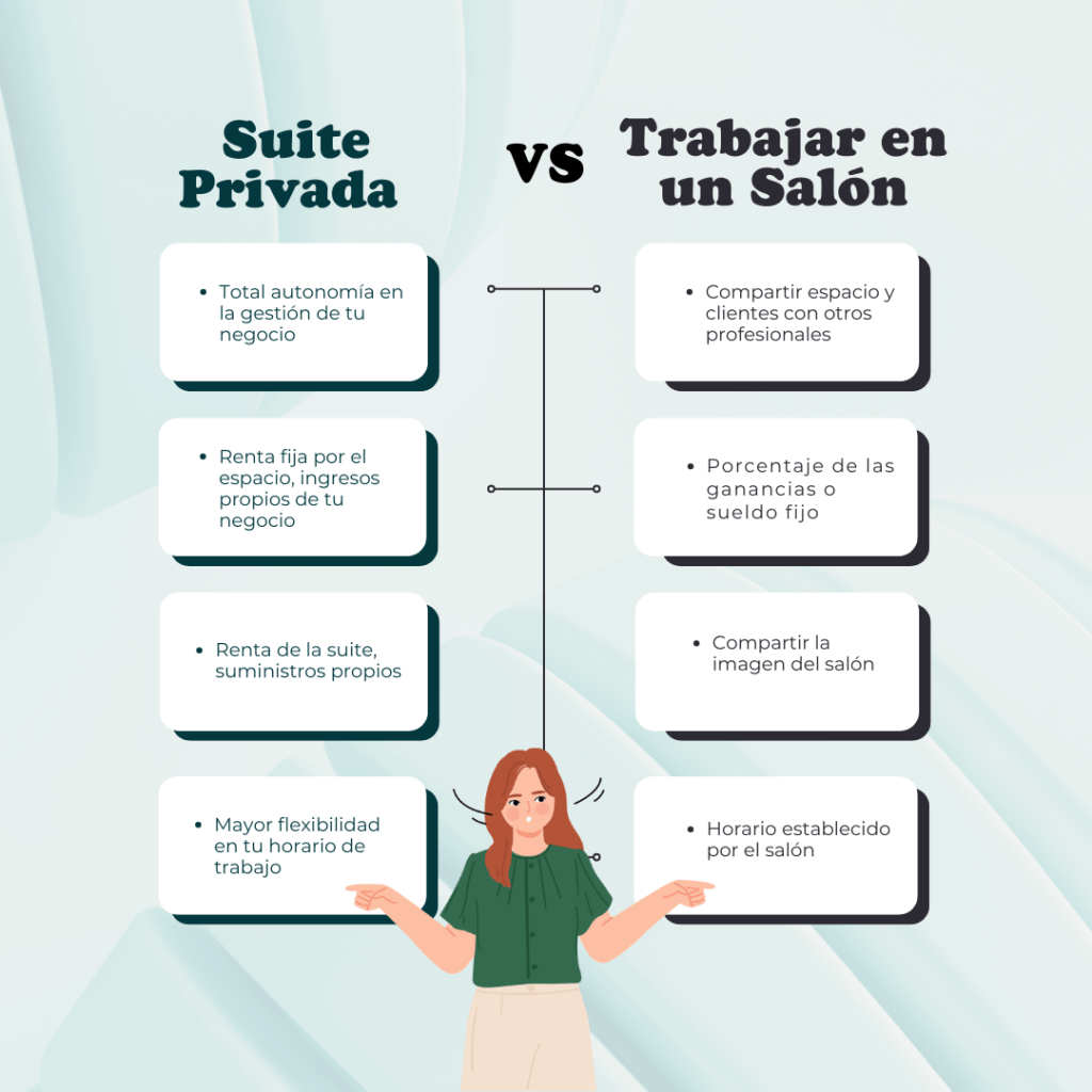 En conclusión, la elección entre una suite privada, alquilar un local o trabajar en un salón dependerá de tus necesidades y objetivos específicos. Si buscas flexibilidad, un ambiente profesional y una mayor autonomía, una suite privada puede ser la opción ideal. Sin embargo, si prefieres compartir un espacio con otros profesionales y tener una estructura más estable, trabajar en un salón podría ser más adecuado.